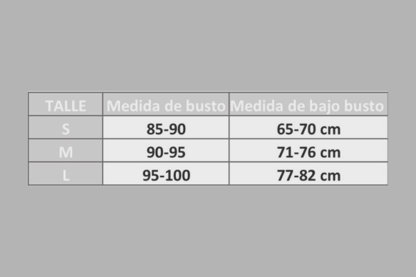 • En caso de estar entre talles, recomendamos elegir según la medida de bajo busto. Este modelo presenta una confección más reducida en la zona de espalda para asegurar sujección.